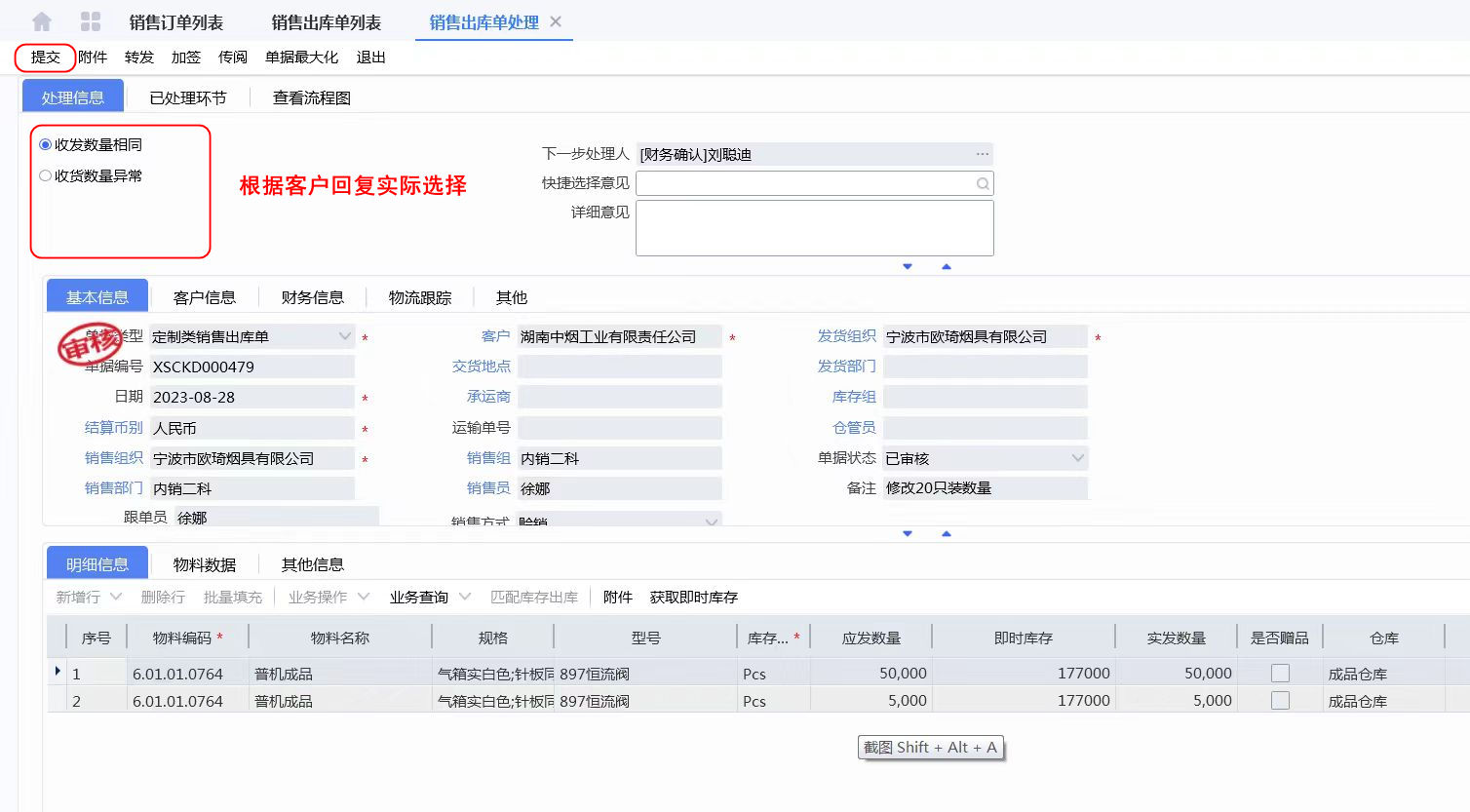 销售出库单有对应的代办任务,需要和客户确认后进行数量确认并录入系统。